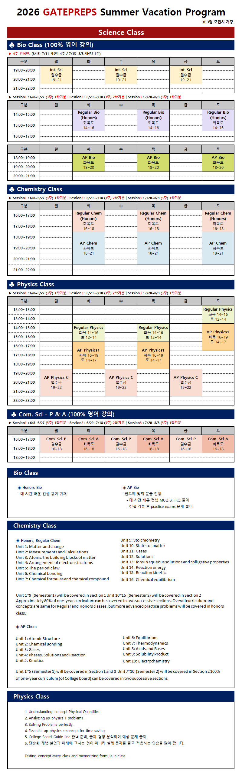 2026 여름특강 AP Class 스케줄