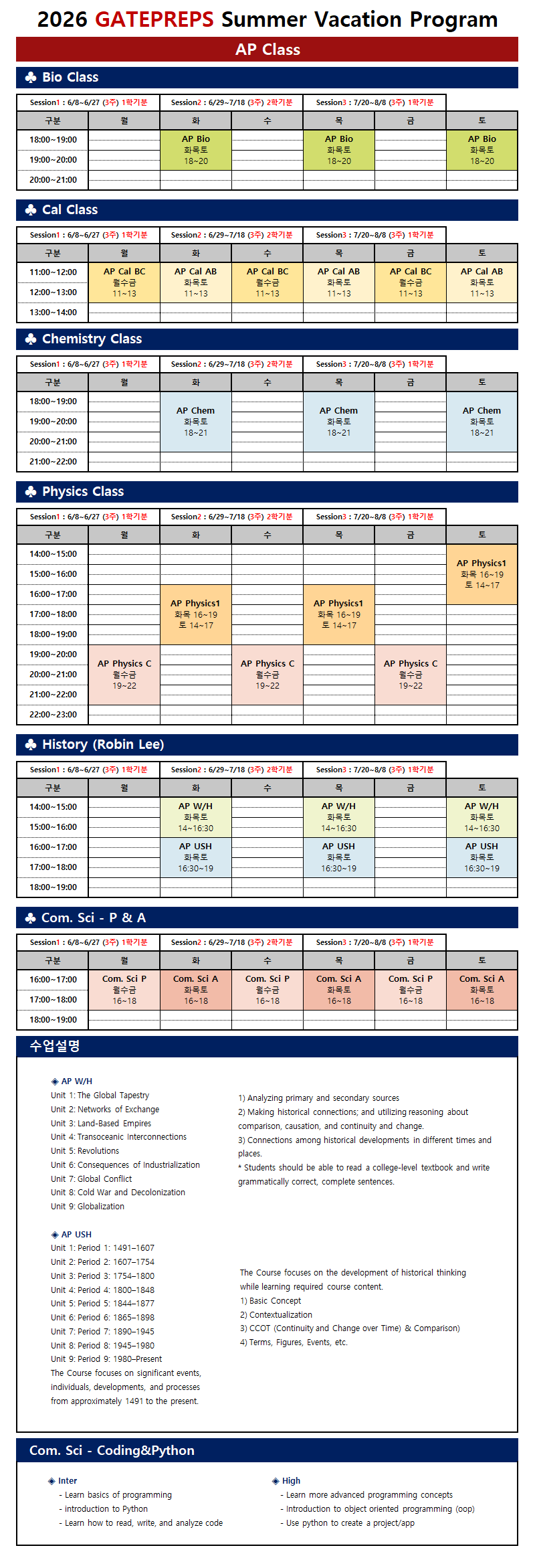 2026 여름특강 AP Class 스케줄