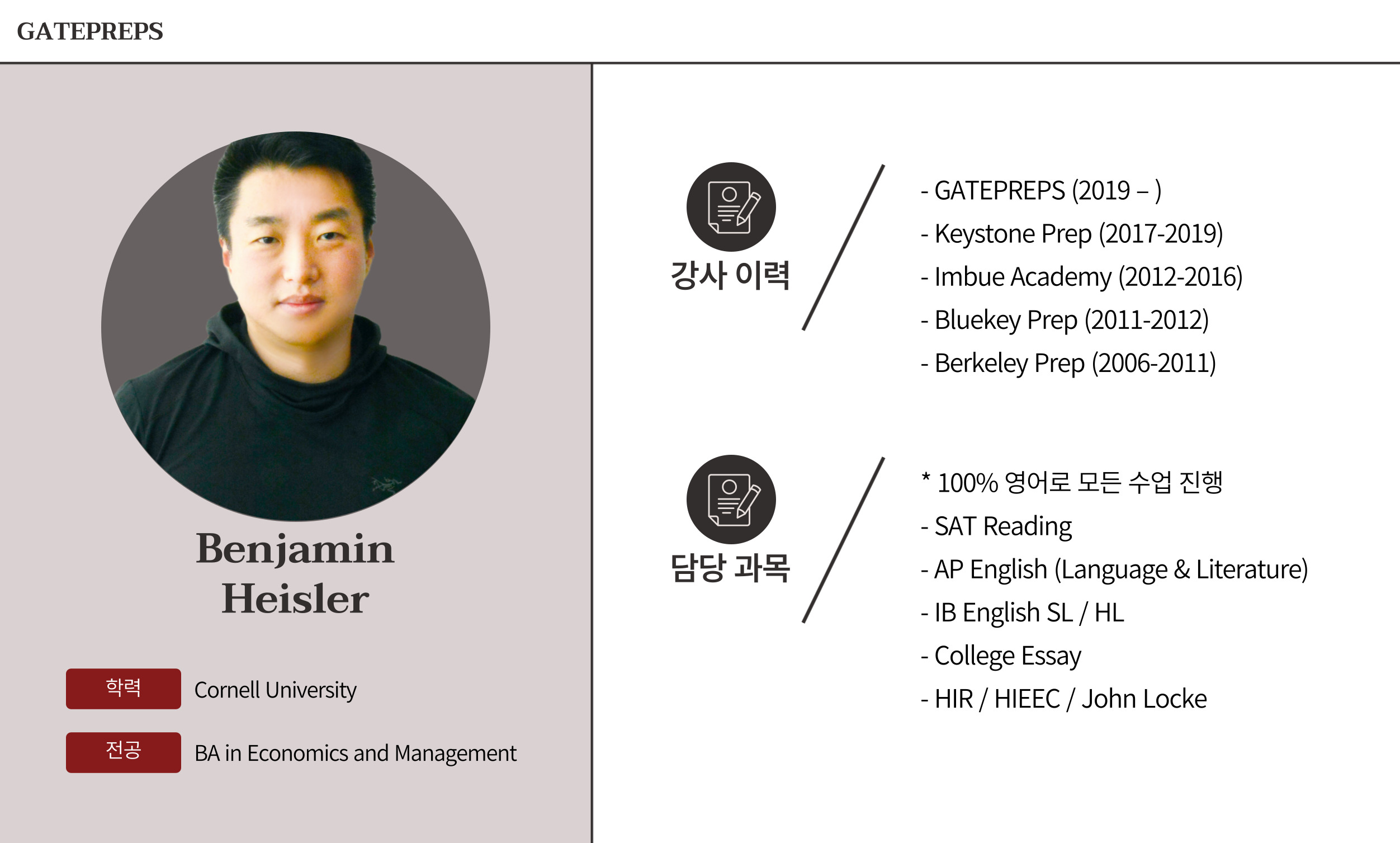 AP Language 2025-2026 겨울방학 특강 정원 : 5명 (선착순 마감) 진도 : 1학기 빠르게 복습후 2학기 선행 개강 : 12/15~1/4 (월화수목금 / 월화수금 / 월화수금 17~19) 강사 : Benjamin 강사 프로필 : 강의 경력 20년의 검증된 전문 강사 SAT, AP Lang, Literature 메인 강사 College Eassy 지도 강사 최근 유형의 문제 최다 보유 수강생 82%이상 5점, 91%이상 4점 획득 강의 특징 : 강의 경력 20년의 축적된 5점 노하우 100% 영어 강의로 AP Language 시험에 최적화 된 강의 최신 유형을 완벽히 반영한 강의 실전문제풀이로 이어지는 5점 Pathway!! 소수인원 마감 정책 ( 정원 5명 ) 으로 꼼꼼한 학생 관리 ( 최다 AP Lahguage 실전 문제 보유 )