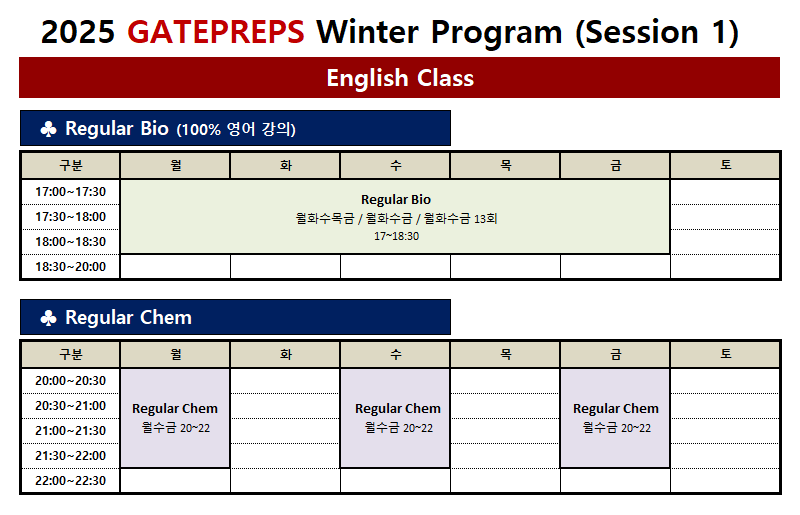 겨울특강 Regular 스케줄 안내 드립니다.