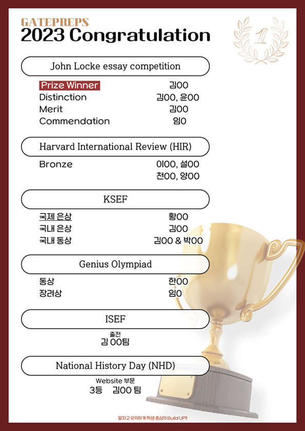 John Locke essay competition ▷ Prize Winner 김00 - $ 2000 장학금 ◁ ▷ Distinction - 김00, 윤00 ◁ ▷ Merit -김00 ◁ ▷ Commendation - 임0 ◁