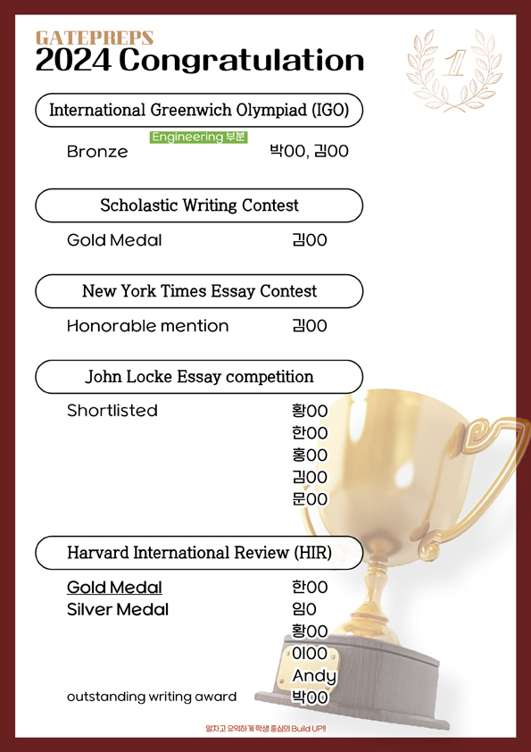 Harvard International Review (HIR) ▷ Gold Medal - 한00 ◁ ▷ Silver Medal - 임0, 황00, 이00, Andy ◁ ▷ outstanding writing award - 박00 ◁