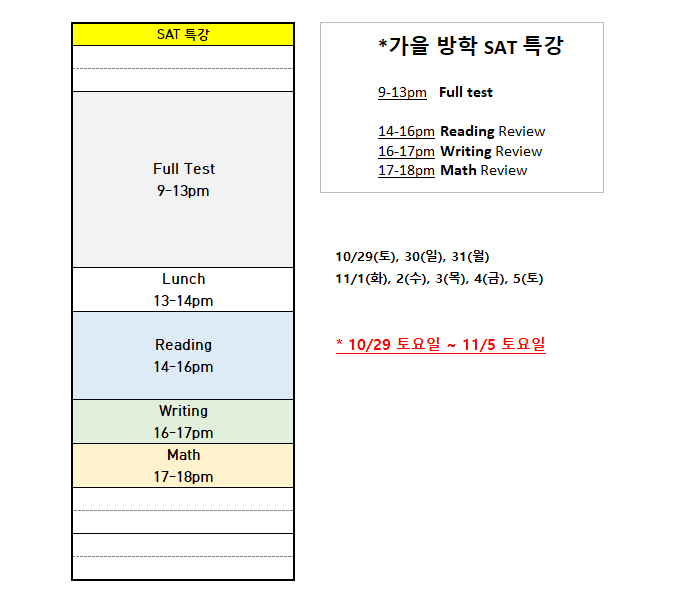 2022 가을 보딩 학생 대상 SAT 특강 스케쥴